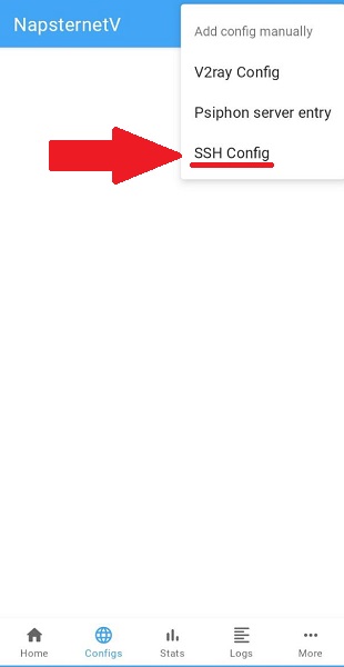 ابتدا از منوی پایین، به بخش configs مراجعه نمایید. سپس از بالای صفحه، برروی علامت + (بعلاوه) کلیک نمایید تا منوی کشویی همانند تصویر زیر به شما نمایش داده شود.