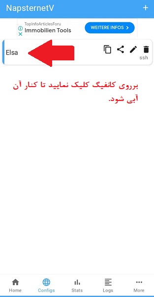 با این کار، مجددا به صفحه configs منتقل میشوید که در آن، کانفیگ شما نمایش داده میشود. برروی کانفیگ اضافه شده کلیک نمایید تا کنار آن آبی شود. سپس از منوی پایین صفحه، برروی Home کلیک نمایید.