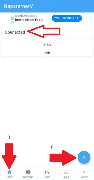 در صفحه Home، برروی علامت پایین صفحه (شماره 2) کلیک نمایید تا اتصال شما به سرور رفع تحریم السا، برقرار شود. پس از اتصال، در بالای صفحه، عبارت Connected نمایش داده خواهد شد.