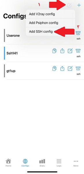 از منوی پایین صفحه، برروی گزینه Configs کلیک نمایید. تا صفحهای مشابه تصویر زیر برای شما باز شود.