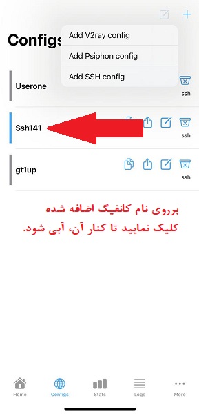 در مرحله بعد، برروی نام کانفیگی که به تازگی اضافه کردید، کلیک نمایید تا کنار آن آبی شود (مشابه تصویر زیر).