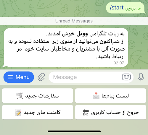 پس از نصب ووتل، در منوی پنل کاربری وردپرس، گزینه چت آنلاین ووتل را مشاهده خواهید کرد. هر زمان که پیام جدیدی، از طرف مخاطبان وبسایت ارسال شود، در پنل نیز مشاهده خواهید کرد.