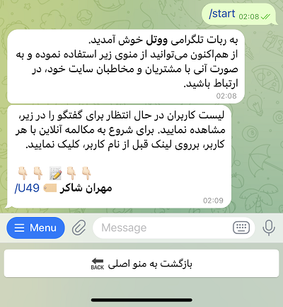 ووتل، نه تنها امکان چت آنلاین را برای شما فراهم کرده است، بلکه در صورت نیاز میتوانید لینک اکانت خود در پلتفرمهای بله، ایتا، سروش و روبیکا را در قسمت تنظیمات ووتل اضافه نمایید، تا کاربر بنا بر ترجیح خودش، یکی از این متدها را برای صحبت و گفتگو با شما، انتخاب نماید.